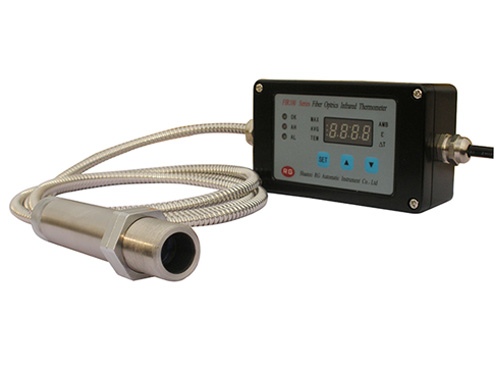 FIR系列光纖紅外測溫儀的測溫范圍為300℃~3000℃(分段實現),固定焦距的精密光學探頭包括不銹鋼圓柱形外殼和透鏡,其可承受的環境溫度高達200℃,光學探頭可安裝空氣吹掃器以防止透鏡被污染。柔性光纜由不銹鋼金屬套所保護,可使光纜較小的半徑彎曲以便其穿過狹小的空間,對無法直接觀察的目標(容器或管道內壁處)進行溫度測量