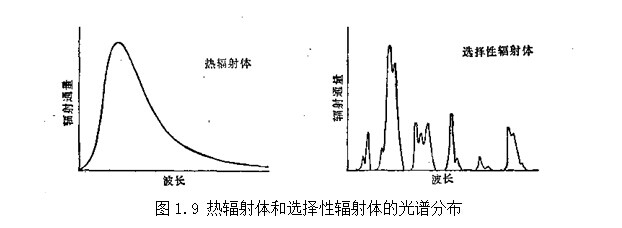 如果用光譜輻射計來考察各種輻射源的光譜分布,可明顯地看出,存在兩類完全不同的輻射源。如果輻射源是灼熱固體或液體,則光譜分布曲線是連續的,僅有一個最大值,其波長隨輻射源溫度而變化,這種輻射源稱為熱輻射體。若輻射源是火焰或氣體中的電氣放電,則光譜分布曲線是不連續的,此時輻射通量集中在狹窄的光譜區間。用高分辨率的單色儀可以發觀,這些區間十分挾窄.陡峭得象一條線.故這種分布稱為線譜。另外,光譜也可以由狹窄的的線帶組成,這種情況稱為帶譜。具有線譜或帶譜的輻射源,稱為選擇性輻射體。初看起來,通量集中的所在波長在整個頻譜上的位置似乎是雜亂的。詳細的考察表明;它們表征了一定類型的輻射原子和分子的特性。因而,這些波長構成了輻射源獨有的特征:線譜是原子的特征,帶譜是分子的特征。